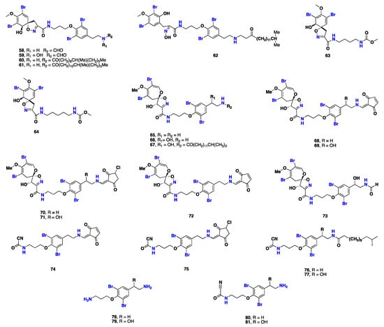 From Figure 5—five antiplasmodial metabolites, including araplysillin N-20-formamide (58), araplysillin N-20-hydroxyformamide (59), araplysillin IV (60), araplysillin V (61), and araplysillin VI (62), were reported from S. ianthelliformis. Compounds 58–62 exhibited weak to moderate inhibitory activities against both chloroquine-resistant and chloroquine-sensitive Plasmodium falciparum strains FcB-1 and 3D7, with IC50 values in the range of 1.0 to 59 µM, and 0.9 to 19.9 µM, respectively []. Subereamollines C and D (63 and 64), isolated from Suberea sp. collected from the Red Sea, displayed weak antiproliferative activity []. Psammaplysins A (65), B (66), D (67), E (68), 19-hydoxypsammaplysin E (69), psammaplysin X (70), 19-hydroxypsammaplysin X (71), psammaplysin Y (72), 19-hydroxyceratinamide A (73), subereamides A–C (74–76), and 12-hydroxysubereamide C (77), in addition to moloka’iamine (78), hyroxymoloka’iamine (79), ceratinamine (80) and hydroxyceratinamine (81), were isolated from a Micronesian sponge Suberea sp. These psammaplysin analogues (65–81) displayed potent cytotoxicity against six human tumor cell lines, namely HCT-15 (colon cancer), PC-3 (prostate cancer), ACHN (renal cancer), MDA-MB-231 (breast cancer), NUGC-3 (stomach cancer), and NCI-H23 (lung cancer), with GI50 values as low as 0.8 μM. This suggests these compounds could serve as promising molecular templates for the development of anticancer agents [] (Figure 5).