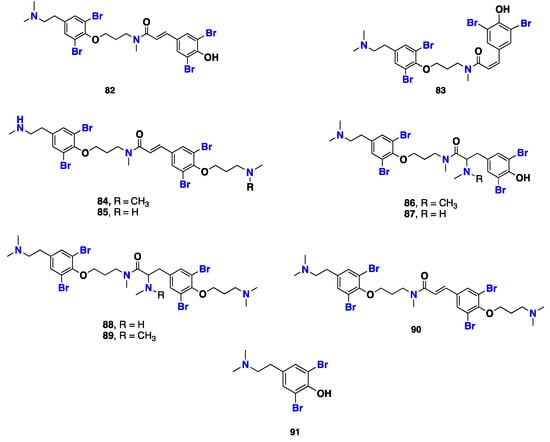 From Figure 6—Al-Mourabit et al. [] reported the isolation of eight tetrabromotyrosine alkaloids, psammaplysenes F–I (82–85), and anomoians C–F (86–89), along with the known natural products psammaplysene D (90) and N,N-dimethyldibromotyramine (91), from the Polynesian sponge S. ianthelliformis. Compounds 82, 83 and 86–89 exhibited moderate cytotoxicity against the KB cell line, whereas 90 was the most potent with an IC50 of 0.7 µM. Although the structures of 88 and 89 resemble that of 90, they exhibited weaker cytotoxicity than 90. It can be hypothesized that the presence of the double bond in the 3,5-dibromo p-hydroxycinnamoyl moiety in 90, instead of the amino or alkylamino group on the carbon adjacent to the amide carbonyl in 88 and 89, was essential for this activity. Curiously, 82, which contains a double bond in the 3,5-dibromo p-hydroxycinnamoyl moiety as in 90, but lacks the N,N-dimethylaminopropyl substituent on the phenolic hydroxyl group of the 3,5-dibromo p-hydroxycinnamoyl moiety, displayed much weaker cytotoxicity than 90. Therefore, both N,N-dimethylaminopropyl and trans-3,5-dibromo p-hydroxycinnamoyl moieties seem to be essential for the cytotoxicity for this series of compounds. Moreover, 90 showed a promising in vitro acetylcholinesterase inhibitory activity with an IC50 of 1.3 µM, as well as a potent activity against fish antifeedant activity [,] (Figure 6).