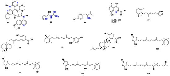 From Figure 7—lihouidine (92), a polycyclic alkaloid featuring two modified aaptamine moieties, was obtained from Suberea n. sp. collected in Australia. Compound 92 displayed moderate cytotoxicity against P388D1 (mouse lymphoma cells) with an IC50 of 3 µg/mL []. Interestingly, structurally less complex metabolites such as 1-(hydroxy(1H-pyrrol-2-yl)methyl)guanidine (93) and 4-(2-amino-3-methylbut-3-en-1-yl) phenol (94) were also isolated from the Red Sea Suberea sp. Compound 93 exhibited low cytotoxicity against HCT-116 and HeLa cell lines, with IC50 values of 25 and 30 µg/mL, respectively, whereas 94 showed moderate cytotoxicity with IC50 values of 20 and 27 µg/mL, respectively. Furthermore, 93 and 94 displayed moderate antifungal activity against Candida albicans at a concentration of 100 µg, with inhibition zones of 8 and 15 mm, respectively []. 5-Hydroxyxanthenuric acid (95) and xanthurenic acid (96) were co-isolated, along with 82–91, from the Polynesian S. ianthelliformis [].