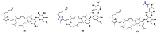 From Figure 8—additionally, three potent cytotoxic glycosylated oxazole-bearing macrolides, 105–107, were isolated from S. creba collected in New Caledonia. These compounds exhibited strong cytotoxicity against seven tumor cell lines, including A549 (human lung carcinoma), BxPC3 (Human primary pancreatic adenocarcinoma), KB, KB-V1 (human cervix carcinoma), LoVo (human colon carcinoma), Namalwa (human Burkitt lymphoma), and SKOV3 ovarian carcinoma), with EC50 values ranging from micromolar to picomolar [,] (Figure 8).