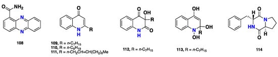From Figure 9—curiously, only few metabolites have been reported from Suberea sponge-associated microorganisms. These include a dibenzopyrazine alkaloid (108) and five quinolone derivatives (109–113), along with the 2,5-diketopeiprazine alkaloid (114) produced by a marine bacterium Pseudomonas sp. isolated from S. creba. Compound 109 displayed promising in vitro antibacterial activity against the marine bacterium V. scala [] (Figure 9).