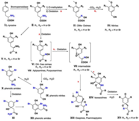 From Figure 10—earlier biosynthetic studies on bromotyrosine derivatives showed that the metabolic cascade is initiated by bromination of tyrosine (I) with bromoperoxidase enzymes to give a brominated tyrosine intermediate II. Then, II can be transformed into V (like purpurealidins A–F) or can undergo further reactions. Route A: Oxidation of the amine to an oxime, affording the intermediate VI. Route B: O-methylation of II, followed by the oxidation of the amine functionality to an oxime (III) or producing compounds such as purpuramines and aplysamines (VIII). Moreover, the first pathway (route A) could also afford phenolic nitriles (IX) and amides (XII), or alternatively, can undergo an epoxidation (A1) to form an intermediate VII. This in turn leads to either (a) the isoxazoline ring system (XIV), producing metabolites such as aerothionin, homoaerothionin, purealdin Q, and purpurealidins A and J, or (b) the oxepine ring system (XIII), as found in the psammaplysins. Moreover, the isoxazoline ring (XIV) can undergo further oxidation and dehydration leading to XV (like purpurealidin B). On the other hand, route B could lead to the pathway featuring a dehydration/decarboxylation (B1) to afford the O-methylated nitriles (IV) [,,,] (Figure 10).