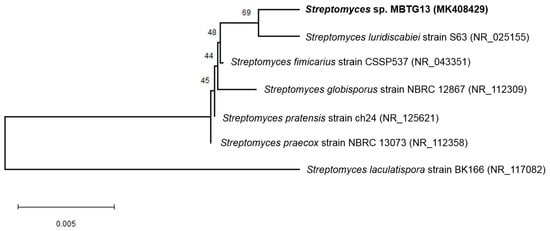 Neighbor-joining phylogenetic tree made by 16S rDNA sequence analysis, showing the position of Streptomyces sp. MBTG13 and its closely related phylogenetic neighbors in the MEGA X. Bootstrap was performed with 1000 replicates. The Kimura two-parameter model was used for measuring distance. Bar indicates 0.5% sequence divergence.