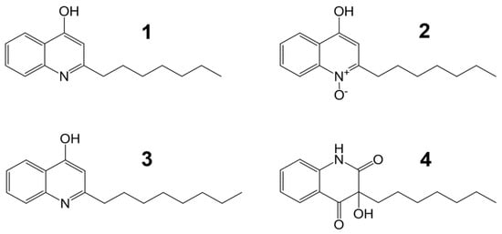 Quinoline alkaloids possess a broad range of biological activities such as anticancer, antimicrobial, antimalarial, and anti-inflammatory activities, and they are found in various organisms, including higher plants [5,6,7], fungi [8,9], and bacteria [10,11,12] such as marine-derived actinomycetes [13]. Among these compounds, 2-alkyl-4-hydroxyquinolines (4-hydroxy-2-alkylquinolines) are frequently found in various strains of Pseudomonas spp. [11,14,15,16,17], and they are known as quorum-sensing molecules, involved in cell-to-cell communication [18].