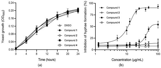 Effects of compounds 1–4 on yeast cell growth and hyphal growth induction in C. albicans SC5314. (a) Effects of compounds 1–4 (each 100 μg/mL) on yeast cell growth in C. albicans. Glucose salt (GS) medium with 1% dimethyl sulfoxide (DMSO) was used as control. The number of cells at each specific time point at 28 °C was assessed by measuring the optical density absorption at 660 nm (OD660). (b) Effects of compounds 1–4 on hyphal formation in C. albicans. Cells (5 × 106 cells/mL) were grown in GS medium containing different concentrations of test compound at 37 °C. At least 200 cells were counted for each sample after 4 h of cultivation. Data are presented as the mean fold changes ± SD of three independent experiments.