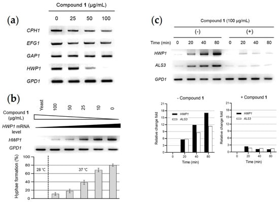 Gene-specific studies and genome-wide analyses have revealed only a small number of hypha-specific genes in C. albicans [21]. These include ALS3, ECE1, HGC1, HWP1, HYR1, RBT1, and RBT4. The most highly expressed gene encodes HWP1, which is one of a small set of hypha-specific genes in C. albicans that include ALS3 (encoding agglutinin-like protein 3) and ECE1 (encoding cell elongation protein 1). Among them, HWP1 and ALS3 encode adhesins and are activated by the transcription regulator Efg1 during hypha formation [22]. Thus, we investigated whether compound 1 also affected HWP1 and ALS3 mRNA levels (Figure 4c). In the absence of compound 1, HWP1 and ALS3 transcripts were undetectable at time zero, but they were strongly expressed from 20 to 80 min. Importantly, compound 1 (100 µg/mL) dramatically reduced the magnitude of HWP1 and ALS3 mRNA expression in compound 1-treated cells, when compared with untreated cells.