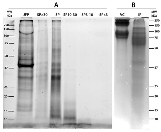 SDS-PAGE analysis of Rhizostoma pulmo jellyfish soluble proteins (20 µg) imaged with ChemiDoc MP Imaging System (A) and stained with Comassie Brillant Blu (B). (A) JFP, Total Jellyfish Proteins; SP > 30, Soluble Protein fraction with MW > 30 kDa; SP, Total SP; SP 10–30, Soluble Protein fraction 10 < MW < 30 kDa; SP 3–10, Soluble Protein fraction with 3 < MW < 10 kDa; SP < 3, Soluble Protein fraction with MW < 3 kDa; (B) VC, Calf skin Collagen (VC); IP, Insoluble Proteins; MW = Molecular-weight size marker.