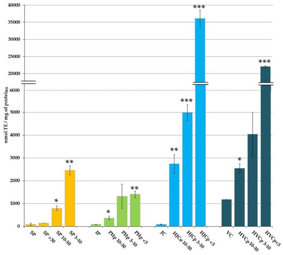 The AA values measured in the fractions PHp 10–30, PHp 3–10 and PHp < 3 were 364.9 nmol TE/mg, 1321.7 nmol TE/mg, and 1403,8 nmol TE/mg of proteins, respectively (Figure 2). Comparing the hydrolysed peptides with the parent proteins, AA values in PHp 10–30, PHp 3–10 or PHp < 3 resulted respectively four, fifteen, or sixteen times higher than the AA measured in the IP fraction.