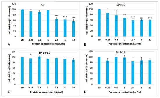Cell viability of human epidermal keratinocytes (HEKa) treated for 24 h with different concentrations of (A) total PBS jellyfish extract (SP); (B) extract fraction containing molecules with a MW > 30 kDa (SP > 30), or (C) with MW 10–30 kDa (SP 10–30) or (D) MW 3–10 kDa (SP 3–10). Data are mean values of six independent experiments performed in five technical replicates, ±standard deviation. Ctr, control. ANOVA statistic test followed by Dunnett’s post-test was used to compare each treatment with the control, * p < 0.05, ** p < 0.01 and *** p < 0.001.