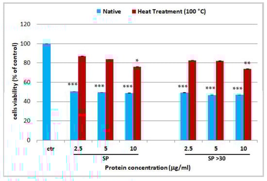 In the present work, in order to verify the presence of proteinaceous venom in our extracts, the two cytotoxic fractions (SP and SP > 30) were heat-denatured by exposure to 100 °C for 10 min before their administration on cells. A loss of cytotoxicity on HEKa was observed after heat treatment of those fractions (Figure 4). This activity reduction was mitigated at the highest tested protein concentrations of 10 µg/mL in both, SP and SP > 30, with p-values of p < 0.05 and p < 0.01, respectively. The difference was likely due to the enrichment of toxins in the SP > 30 fraction, after membrane filtration, as compared to the whole extract (SP). In addition, as the cytotoxicity has not completely declined, at least at the highest concentration, some heat-resistant proteins should be still present. This confirms previous observations on the fibrinogenolytic activity of R. pulmo tentacle extract, which was significantly reduced but not abolished by heat treatment for 1 min at 100 °C [91], suggesting that some active components of the R. pulmo extracts are not completely thermolabile.