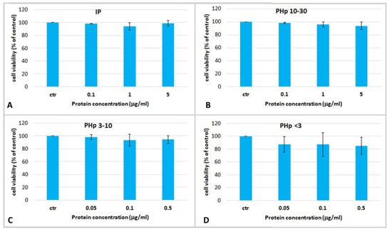 The cell viability was assayed after 24 h of treatment with the pepsin-hydrolyzed jellyfish peptides PHp 10–30, PHp 3–10 and PHp < 3 and with the undigested fraction IP, at concentrations ranging from 0.05 to 5 µg/mL (Figure 5). No cytotoxic effect and no significant changes of cell viability, as compared to the controls, was evident in keratinocytes treated with all the hydrolyzed protein fractions at all tested concentrations.