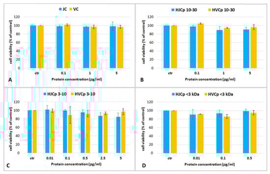 The cell viability of HEKa cells was also assayed after a 24 h-treatment with different concentrations of collagenase-hydrolyzed jellyfish peptides: HJCp 10–30, HJCp 3–10 and HJCp < 3 (Figure 6). The effects on HEKa of the bovine collagen fractions (HVCp 10–30, HVCp 3–10 and HVCp < 3), subjected to the identical fractionation procedure, HVCp 10–30, HVCp 3–10 and HVCp < 3, tested at the same concentrations, are also shown. Pepsin-digested fractions before collagenase digestion, JC and VC, were also tested.