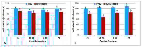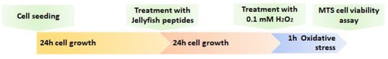 In the experiments for antioxidant activity assay, HEKa cells (0.15 × 106 cells/well) were grown for 24 h to reach 80% of confluence in flat bottom 96-well microplates, and then were treated with the collagen peptides fractions from jellyfish and from bovine collagen at the same concentrations. Two controls with medium and vehicle were also included. After 24 h, 100 µL medium contained H2O2, at the final concentration of 0.1 mM were supplied and cells were incubated for 1 h at 37 °C with 5% CO2, as reported in Figure 7. Cell viability was assayed by MTS assay soon after the 1 h of treatment.