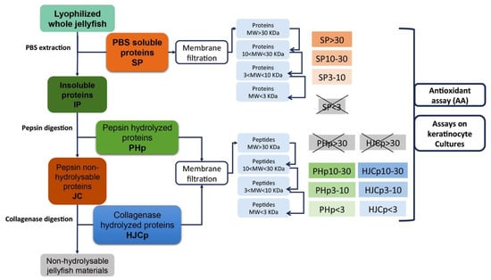 The lyophilized Rhizostoma pulmo whole jellyfish samples (umbrella and oral arms) were subjected to aqueous protein extraction by phosphate-buffered saline (PBS) to separate the hydro-soluble fractions from the insoluble ones, which were eventually exposed to a two-step sequential enzymatic digestion.