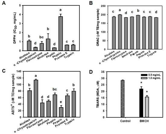 Antioxidant abilities of blue mussel hydrolysates with various proteolytic enzymes determined by (A) DPPH scavenging assay, (B) ORAC assay, (C) ABTS+ radical assay, and (D) TBARS assay. a–d Different letters on the bar charts indicated significant differences (p < 0.05). * p < 0.05 vs. control.