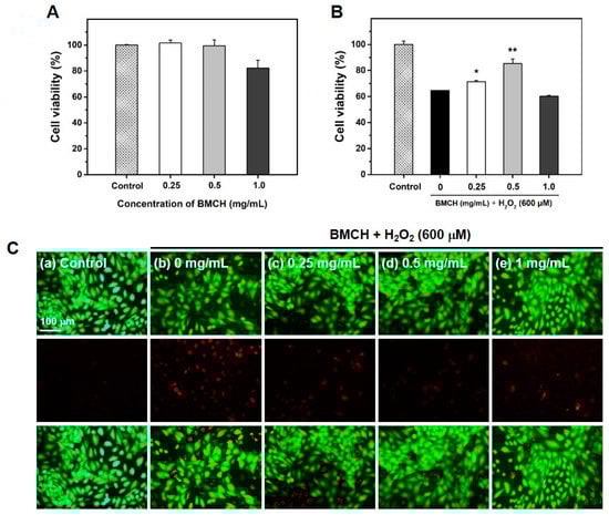 The live/dead cell assay was utilized for fluorescence staining of viable and dead cells. The cells were simultaneously dual-stained with calcein-AM and PI, which produce green fluorescence in live cells and red fluorescence in dead cells, respectively. After treatment with BMCH and H2O2 in a 12-well black plate for 24 h, the cells were incubated with 0.5 μM calcein-AM and 5 μM PI dye solution at 37 °C for 20 min while protected from light. After washing PBS, viable and dead cells labeled with calcein-AM and PI were visualized under a fluorescence microscope (Leica DMI 6000 B, Wetzlar, Germany).
