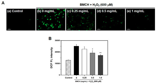 (A) Determination of intracellular ROS production by DCFH-DA staining under a fluorescence microscope and (B) quantitative intracellular DCF fluorescence intensity in H2O2-treated HUVEC. Cells were pretreated with BMCH for 30 min, followed by exposure of H2O2 (600 μM) and incubation for 24 h. * p < 0.05 and ** p < 0.01 vs. H2O2 only treatment.