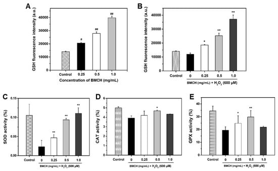 Quantification of intracellular GSH levels under (A) normal and (B) oxidative stress condition and determination of antioxidant enzyme levels (C) SOD, (D) CAT, and (E) GPx activities. Cells were treated with BMCH for 24 h for measurement of GSH level under normal condition. Cells were pretreated with BMCH for 30 min followed by exposure of H2O2 (600 μM) and incubation for 24 h for measurement of GSH under oxidative stress condition and antioxidant enzyme activities. Differences were considered statistical significance at # p < 0.05 and ## p < 0.01 compared with the control, and * p < 0.05 and ** p < 0.01 compared with the cells treated with H2O2 only treatment.
