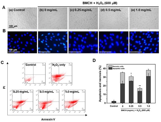 Effects of BMCH on apoptosis in H2O2-treated HUVEC injury. (A) Cellular morphology and (B) nuclear morphology by H33342 staining under a fluorescence microscope. (C) FACS analysis using Annexin V-FITC apoptosis kit and (D) quantification of apoptotic and necrotic cells by FACS analysis. * p < 0.05 and ** p < 0.01 vs. H2O2 only treatment.