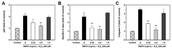 Effect of BMCH on mRNA expressions by RT-qPCR. (A) p53, (B) bax/bcl-2 ratio, and (C) caspase-3. Cells were pretreated with BMCH for 30 min followed by exposure of H2O2 (600 μM) and incubation for 24 h. * p < 0.05 and ** p < 0.01 vs. H2O2 only treatment.