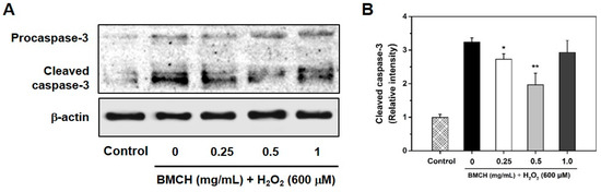 (A) Representative western blotting of procaspase-3 and cleaved caspase-3, and (B) the relative expression level of cleaved caspase-3 protein level in H2O2-mediated HUVEC injury. Cells were pretreated with BMCH for 30 min followed by exposure of H2O2 (600 μM) and incubation for 24 h. * p < 0.05 and ** p < 0.01 vs. H2O2 only treatment.