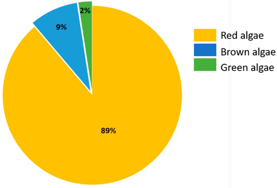 Over the past four decades, reports about the isolation of haloaryl secondary metabolites from macroalgae have been increasing, describing about two hundred halogenated aromatic secondary metabolites. Among algae, macroalgae—including brown, green, and red algae—are an important source of these secondary metabolites, with red algae being responsible for the production of nearly 90% of these compounds identified thus far (Figure 1).