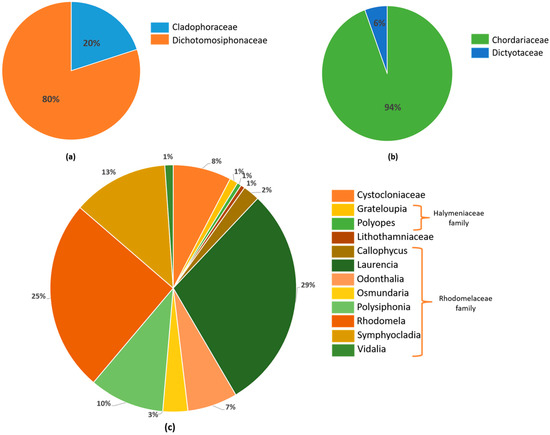 Distribution of the haloaryl secondary metabolites in (a) green, (b) brown, and (c) red algae by genus and family.
