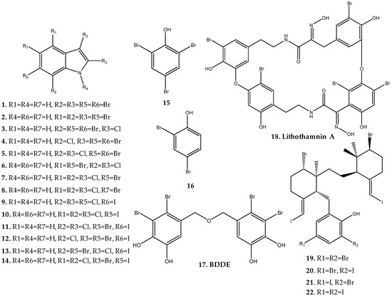 Although halophenols have been isolated from a wide range of genera, the isolation of halo-indoles, -sesquiterpenes and -naphthalene derivatives have been mainly reported from a restricted number of genera, namely, the Rhodophyllis and Laurencia genera.