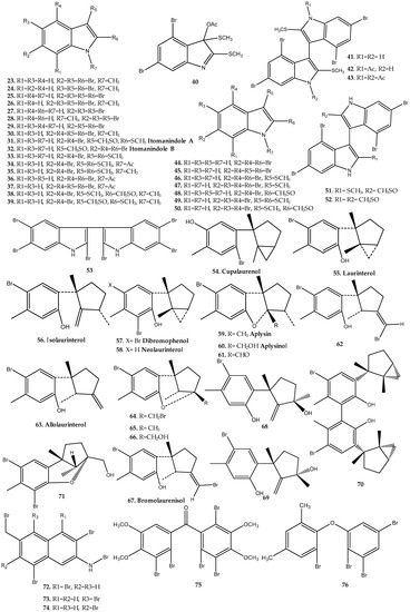 Among haloindoles, the isolation of mono-indoles (39 compounds) is more common than dimers (only 7 compounds) and, in contrast to halophenols, the isolation of trimers or tetramers of haloindoles was not described (Table 1). Concerning the nature of the halogen, there are many more cases of indoles with chloro (13 compounds) or iodo (6 compounds) than in the halophenols class (Table 1). Nevertheless, the majority of the indoles presents two or three bromine atoms as happens with the phenol class.