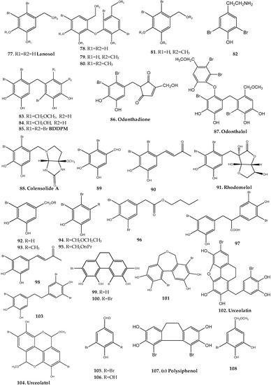 Popplewell and Northcote reported the isolation of a new nitrogenous bromophenol, colensolide A (88), together with the known bromophenol lanosol (77), as well as its methyl ether (81), and the aldehyde (89) and butenone (90) derivatives of lanosol and rhodomelol (91) from the New Zealand red alga Osmundaria colensoi (Figure 5, Supplementary Table S1) [34]. Compounds 77, 81, and 88–91 were evaluated for cytotoxicity against the HL-60 human leukemia cell line and for antibacterial activity against the MC2155 strain of Mycobacterium smegmatis. Lanosol butenone (90) exhibited moderate activity against HL-60 human leukemia cells (IC50 = 8.0 µM), whereas lanosol methyl ether (81), lanosol butenone (90), and rhodomelol (91) exhibited antibacterial activity against the MC2155 strain of Mycobacterium smegmatis (IC50 values of 7.8, 26.2, and 28.1 µM, respectively) [34].