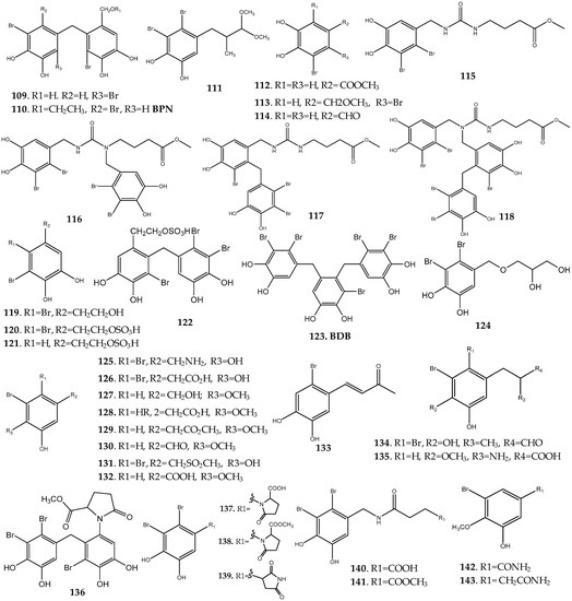 Rhodomela confervoides, an alga commonly found along the coastlines of China, Japan, and Korea, has been reported as a source of bromophenols with diverse pharmacological activities, such as antibacterial, antitumor, antidiabetic, and antioxidant (Supplementary Table S1). In 2003, bis-phenols 109 and 110 (Figure 6), described for the first time, as well as the known bis-phenols 17, 83, and 85 were isolated from the methanolic extract of this marine alga and evaluated for their antibacterial activity against four ATCC standard bacteria strains (Staphylcoccus aureus ATCC29213, Staphylcoccus epidermidis ATCC12228, Escherichia coli ATCC25922, and Pseudomonas aeruginosa ATCC27853), as well as four bacteria strains isolated from clinic (S. aureus 02-60, S. epidermidis 02-04, E. coli 02-26, and P. aeruginosa 02-29). All compounds exhibited antibacterial activity, with compound 17, the only bis-phenol linked by an oxygen atom, being the most active [15]. The same researchers isolated metabolite 111, a bromophenol derivative with an aliphatic chain as substituent, found in R. confervoides algae extracts [9]. Later, the promising antibacterial activity on these bacterial strains by bromophenol 17 was confirmed by Han et al. [42]. In addition to this compound, these researchers reported the isolation of the new monoaryl bromophenol 112 and two known structure-related secondary metabolites 113 and 114 (Figure 6). Compounds 17 and 112–114 showed antiproliferative activity in several human tumor cell lines (epithelial tumor cell (KB), human hepatocellular carcinoma (Be17402), and lung cancer cells (A549)), with 112, a bromophenol with an ester group, being the most potent (3.54 < IC50 < 3.09 µg/mL) [42]. Ma et al. reported the isolation of eight new bromoaryl secondary metabolites with an unusual structure, particularly bromophenols with a C–N coupled with methyl γ-ureidobutyrate (115–118), the phenylethanol bromophenol (119), and three phenylethanol sulfate bromophenols (120–122) from R. confervoides (Figure 6) [43]. Among these secondary metabolites, only halophenols 119–122 displayed moderate cytotoxicity against a panel of five human cancer cell lines—lung adenocarcinoma (A549), human ovarian (A2780), hepatoma (Bel7402), stomach (BGC-823), and human colon (HCT-8) cancer cell lines [43].