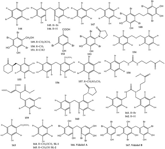 The only report about haloaryl secondary metabolites described in algae from Vidalia sp. concerns the isolation of two bromophenols, vidalols A (166) and B (167), from the Caribbean red alga Vidalia obtusaloba (Figure 7) [54]. Wiemer et al. described that these two compounds significantly reduced the edema when applied topically to phorbol ester (PMA)-induced swelling of the mouse ear [54]. Moreover, both compounds inhibited bee venom phospholipase A2 (PLA2), showing an inhibition percentage of 96% at 1.6 µg/mL, suggesting their potential as lead compounds to design new PLA2 inhibitors [54]. According to Wiemer et al., the production of these bromophenols in V. obtusaloba could be important as a defense mechanism against some marine herbivores, an example being vidalol A (166) that has been shown to reduce the grazing of Thalassia testudinum by Caribbean herbivorous fishes [54,55].
