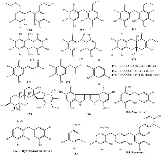Naturally occurring haloaryl secondary metabolites 168–184. Further information is provided in Supplementary Table S1.