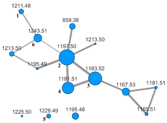 The molecular network was created using the online workflow at GNPS. The data was filtered by removing all MS/MS peaks within ±17 Da of the precursor m/z. MS/MS spectra were window filtered by choosing only the top six peaks in the ±50 Da window throughout the spectrum. The data was then clustered with MS-Cluster with a parent mass tolerance of 0.02 Da and a MS/MS fragment ion tolerance of 0.02 Da to create consensus spectra. Further, consensus spectra that contained less than four spectra were discarded. A network was then created where edges were filtered to have a cosine score above 0.5 and more than six matched peaks. Further edges between two nodes were kept in the network if and only if each of the nodes appeared in each other’s respective top 10 most similar nodes. Data were imported into Cytoscape 3.6.0 (available online: http://www.cytoscape.org/) and displayed as a network of nodes and edges.