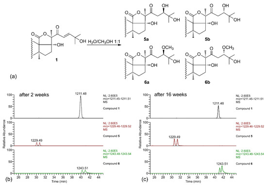 (a) Scheme of the solvolysis reaction occurring between the α,β-unsaturated ketone in the side chain of holothurin A5 (1) and a solution of MeOH/H2O (1:1); (b) LC-MS analysis of compound 1 after having left the compound in a solution of MeOH/H2O (1:1). Two isomeric saponins at 1229.5 (addition of H2O) and two isomeric saponins at 1243.5 (addition of MeOH) appeared in the spectrum; (c) LC-MS analysis of compound 1 left in the same solution of MeOH/H2O (1:1) repeated after 16 weeks. The peaks of the additional saponins showed an increasing intensity.
