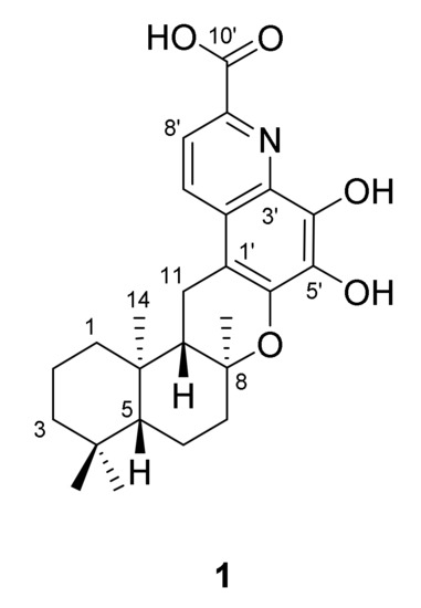 Saccharoquinoline (1) was isolated as a viscous oil by repeated C18 silica flash column fractionation and final C18 HPLC purifications. The molecular formula of 1 was deduced as C25H31NO5 from the analysis of HRESIMS data in combination with NMR spectroscopic data. A strong IR absorption at 1708 cm-1 indicated the presence of carbonyl functionality, which was ultimately assigned as a carboxylic acid. The 1H-NMR spectrum of 1 exhibited two doublet ortho-aromatic protons (H-7′ (δH 8.40, 1H, J = 8.6 Hz) and H-8′ (δH 7.92, 1H, J = 8.6 Hz)), and four methyl singlets (H-12 (δH 0.85), H-13 (δH 0.90), H-14 (δH 0.94), and H-15 (δH 1.18)). The 13C NMR and HSQC spectroscopic data also indicated the presence of four methyl singlets (C-12 (δC 21.5), C-13 (δC 33.2), C-14 (δC 14.6), and C-15 (δC 20.3)), six methylenes (C-1 (δC 38.5), C-2 (δC 18.0), C-3 (δC 41.3), C-6 (δC 19.3), C-7 (δC 40.3), and C-11 (δC 17.9)), two methines (C-5 (δC 55.3) and C-9 (δC 51.2)), two aromatic methines (C-7′ (δC 132.1) and C-8′ (δC 116.9)), three un-protonated sp3 (C-4 (δC 32.8), C-8 (δC 78.1), and C-10 (δC 36.6)), and eight un-protonated sp2 carbons (C-1′ (δC 104.9), C-2′ (δC 122.8), C-3′ (δC 133.6), C-4′ (δC 135.0), C-5′ (δC 136.9), C-6′ (δC 145.8), C-9′ (δC 140.8), and C-10′ (δC 165.6)) (Table 1).