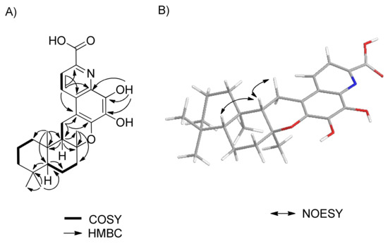 The complete relative stereo-structure of 1 was readily derived by the interpretation of NOESY NMR correlations of the drimane skeleton. NOESY correlations between H-9 and H-11β (δH 2.69), and H-5 and H-9 indicated that those protons (H-5, H-9, and H-11β) were located on the same side of the tricyclic ring system (Figure 2B).