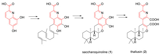 It is not clear how these two metabolites are related. On the basis of feasible chemical conversions, the vicinal aromatic diol of 1 can be oxidized to the ring open dicarboxylic acid, in a fashion that is analogous to the oxidation of catechol to muconic acid [10]. Saccharoquinoline (1) and thallusin (2) show rare quinoline starting at the terpenoid pathway (Figure 3). A quinoline moiety from lodopyridones, which was isolated from the same strain, also supports this hypothesis [1,2].