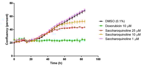Colon cancer cell (HCT116) growth in saccharoquinoline (1)-treated and vehicle-treated (DMSO, 0.1%) cells measured using live cell imaging. Doxorubicin treated cells were used as a control for cytotoxicity.