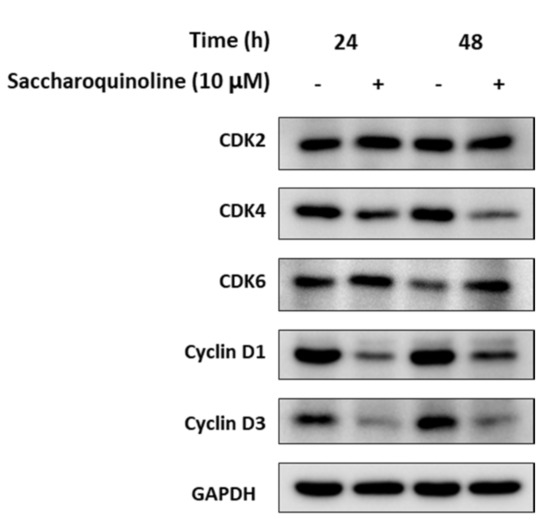 Saccharoquinoline (1, 10 μM, with 0.1% DMSO) or vehicle (DMSO, 0.1%) was added to HCT116 cells cultured in a basal culture media supplemented with 1% FBS. Cells were harvested 24 h and 48 h after treatment and were lysed with RIPA (radioimmunoprecipitation assay) buffer (Roche, Basel, Switzerland) containing protease and phosphatase inhibitors (Roche). Cell lysates were kept on ice for 30 min and centrifuged at 15,000 rpm for 20 min. Then, supernatants were transferred into new tubes and the protein concentrations were measured using a BCA protein assay kit (Thermo Fisher Scientific, Waltham, MA, USA). Next, the protein extracts (30 μg) were electrophoresed and transferred to a PVDF membrane (EMD Millipore, Burlington, MA, USA). Then, the membrane was incubated with primary antibodies against CDK2, CDK4, CDK6, cyclin D1, cyclin D3, and GAPDH, purchased from Cell Signaling Technology (Danvers, MA, USA), at 4 °C overnight. The primary antibodies were detected by incubation with a horseradish peroxidase-conjugated secondary antibody (Bethyl Laboratories, Montgomery, TX, USA) at 25 °C for 1 h. Bindings of antibodies were visualized by an ImageQuant LAS4000 imager (GE Healthcare Life Sciences) after incubation with an ECL substrate (Bio-Rad, Hercules, CA, USA).
