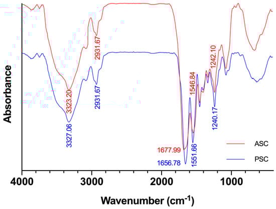 The FTIR spectra of ASC and PSC are exhibited in Figure 1. Each peak in the FTIR spectrums corresponds to the vibration of functional groups in the molecule []. The secondary structure of collagen is closely related to different types of hydrogen bonds []. By analyzing the FTIR spectrum of ASC and PSC, the different effects of the two extraction methods on the secondary structure of collagen were obtained. At room temperature, ASC and PSC mainly exhibited five absorption peaks at 3323 cm−1, 2931 cm−1, 1677 cm−1, 1546 cm−1, and 1242 cm−1, corresponding to amide A, amide B, amide I, amide II, and amide III, respectively.