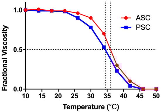 Thermal denaturation curves of ASC and PSC from Nile tilapia skin. The denaturation temperature was determined as the mid-point temperature where viscosity changes reach 0.5.