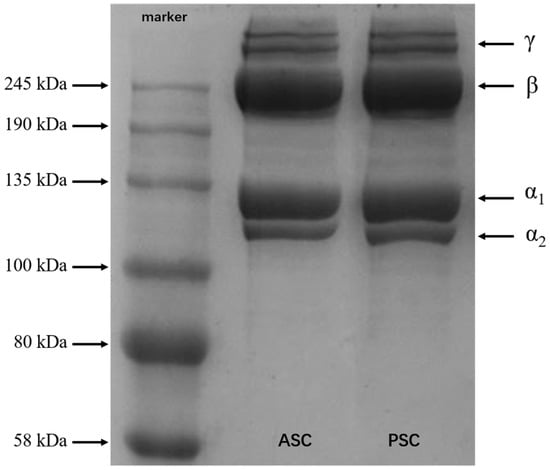 SDS-PAGE results present the subunit composition and type of collagen instinctively. As shown in Figure 3, ASC and PSC have very similar protein bands, which have been identified as trimers (γ chains), dimers (β chains), and two alpha chains (α1 and α2). Up to now, it has been reported that there are two different collagen trimers in tilapia skin, (α1)2α2 and α1α2α3, and that the two chains of α1 and α2 have the same molecular weight, which cannot be distinguished by electrophoresis []. According to Sun [], the structure of Nile tilapia collagen is (α1)2α2 type. The band intensity of α1 is twice that of α2, indicating that both ASC and PSC are type I collagen. In addition, the electrophoresis bands are clear, and have no low molecular weight bands, showing that the molecular structure of collagen was well preserved during the extraction process. Although some telopeptides were lost after the treatment of PSC, the banding pattern of PSC was similar to ASC, indicating that the PSC extraction process does not affect the integrity of the triple-helix structure.