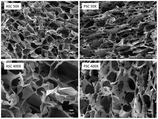 Figure 4 shows the ultrastructure of the cross-section of the lyophilized collagen sponge. The graphs showed that ASC and PSC exhibit slightly different microscopic morphology. From the 50× magnified image, ASC and PSC display a loose porous network structure, but the pores of ASC show a more uniform and less fiber structure pattern than PSC. As shown in the 400× magnified image, ASC is a dense sheet-like film with uniform alignment, and PSC exhibits irregularly arranged curls.