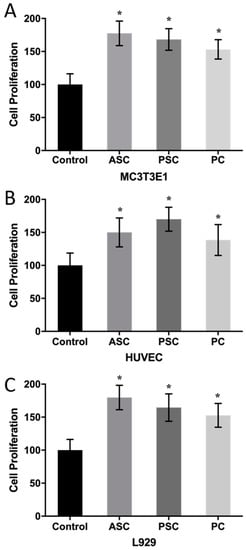 The effect of ASC, PSC, and porcine collagen (PC) on cell proliferation. (A): MC3T3E1, (B): L929, (C): HUVEC. Values with * show significant differences (p < 0.05) between groups, as determined by one-way ANOVA.