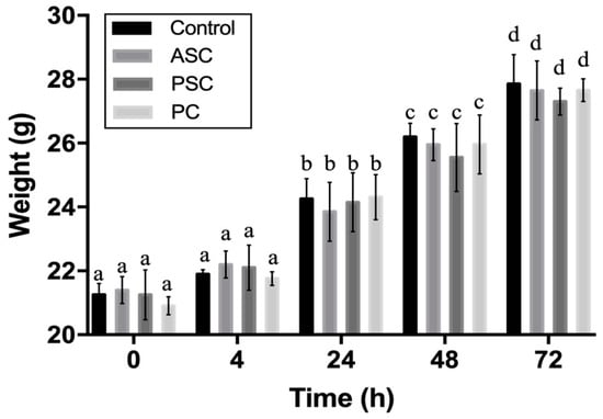 The acute systemic toxicity assay was usually selected to measure the adverse effect of biomedical materials that result either from a single exposure or from multiple exposures in a short period of time. It is an important indicator of biosafety assessment []. To evaluate the biosafety of aquatic collagen, porcine collagen was designated as a comparison group. As shown in Figure 6, no significant difference in body weight was observed between the experimental groups and the control group at four hours, 24 h, 48 h, and 72 h after the intraperitoneal injection of the collagen leach liquor. Moreover, the weight of the control group and the experimental groups increased significantly over time, and no dead samples appeared. Furthermore, there were no significant differences between the ASC, PSC, and PC groups. The results showed that ASC and PSC collagen sponges were produced by our process without acute systemic toxicity, and there was not a significant difference from the acute toxicity from commercially available porcine collagen products.