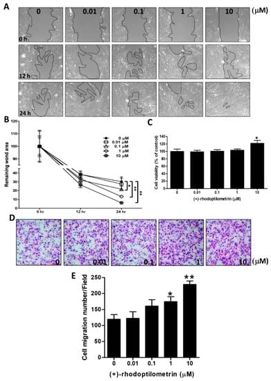 2.1. Effects of (+)-Rhodoptilometrin on Wound Healing, Cell Viability, and Cell Migration in hGF-1 Cells