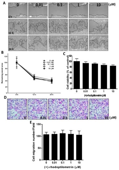After cells were seeded in 24-well plates (50,000 cells per well) and cultured for 24 h, the culture medium was changed to a serum-free culture medium for 12 h, and a 10-μL tip was used to make a scratch across the cell monolayer at the bottom of each well. Subsequently, phosphate-buffered saline (PBS) was used to wash the cells; then 0, 0.01, 0.1, 1, and 10 μM (+)-rhodoptilometrin was added, and the cells were further cultured for another 24 h. At 0, 12, and 24 h, the inverted phase-contrast microscope and digital camera were used to observe the same location and record the “wound region”. The ImageJ analysis software (version 1.50d, National Institutes of Health, Bethesda, MD, USA) was used to analyze the “wound-healing” area, and the residual “wound” regions were compared among groups.