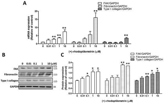 Effects of (+)-rhodoptilometrin on the messenger RNA (mRNA) and protein expression of focal adhesion kinase (FAK), fibronectin, and type I collagen in hGF-1 cells. (A) The expression of FAK, fibronectin, and type I collagen mRNA in hGF-1 cells was determined by qRT-PCR analysis after treatment with various dosages of (+)-rhodoptilometrin for 24 h. The relative FAK, fibronectin, and type I collagen mRNA levels were calculated from the ratio of FAK, fibronectin, and type I collagen over that of an internal control GAPDH gene. (B) FAK, fibronectin, and type I collagen expression in hGF-1 cells were evaluated by western blot analysis after treatment with various dosages of (+)-rhodoptilometrin for 24 h. Glyceraldehyde 3-phosphate dehydrogenase (GAPDH) was detected as an internal control. (C) The FAK, fibronectin, and type I collagen levels were quantified by protein band densitometry analysis using ImageJ software and normalized with the level of GAPDH. Data (means ± SEM) are representative of at least three independent experiments. Student’s t-test determined the significance; * p < 0.05, ** p < 0.01, compared with untreated cells.