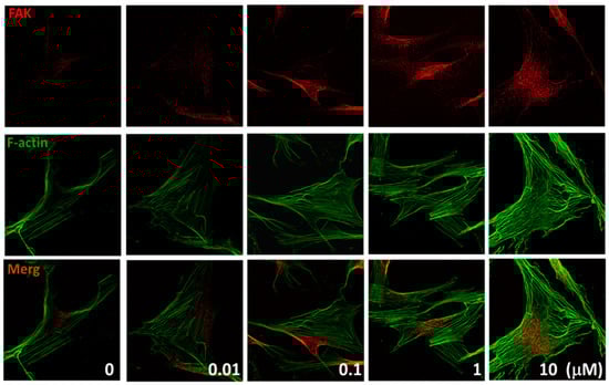 Immunofluorescence was used to evaluate the effects of different (+)-rhodoptilometrin concentrations (0.01, 0.1, 1, and 10 μM) on the distribution of FAK and F-actin (actin filaments) in hGF-1 cells, and this was observed using a confocal microscope. FAK and F-actin protein expression levels are associated with cell migration. The experiment results showed that, in the control group, FAK was present throughout the cell. However, after treatment with (+)-rhodoptilometrin, FAK (red color) was localized to the focal adhesions around the cells. Moreover, F-actin (green color) proteins were observed to be arranged in dense parallel arrays of bundles (Figure 4). The experimental results showed that (+)-rhodoptilometrin can increase the protein expression of FAK and F-actin and promote cell migration.